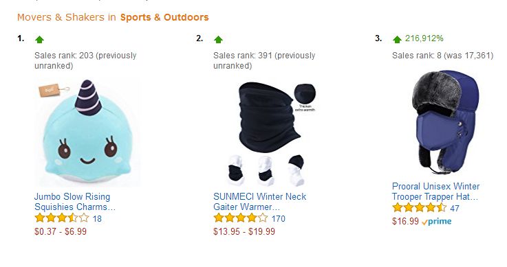 在亚马逊“Sports & Outdoors”飙升榜单中,这款产品直接爆表,数据统计直接都统计不到了,因为增长太过迅速。从下图的榜单截图可以看出飙升幅度肯定超过了排名第三的冰雪天神器“火车头帽子”,这款帽子的数据是216912%。