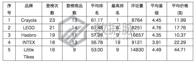 2017年5月22日-2017年5月28日,共有508款商品登榜亚马逊 Toys & Games 品类的相关榜单,其中涉及品牌数260个。截至2017年5月28日,登榜商品总评论数达318067条,平均星级4.06星。