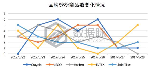 可以看到,在上周 Toys & Games 品类的 Best Seller 榜单中,在减压产品长期霸榜的情况,两个品牌为儿童玩具产品逐渐崭露头角。其中,儿童玩具品牌 Little Tikes 继续发力,凭借在2017年5月24日一枝独秀的精彩表现,以25次登榜、共6款登榜商品位列综合排名第一位;儿童玩具品牌Fisher-Price的表现不逊于其他三款指尖陀螺,以登榜商品数逐步上升趋势位列品牌综合排名第四位。