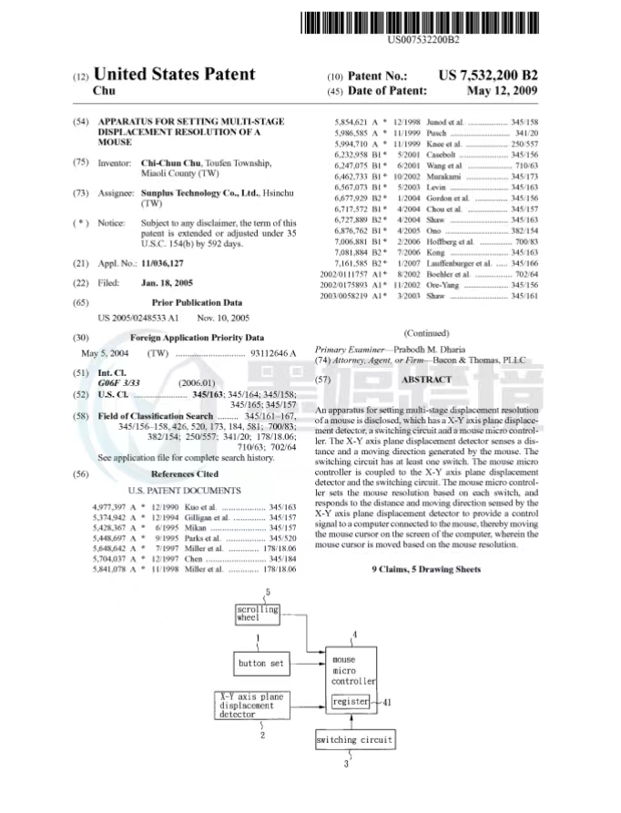 本案涉及一项美国发明专利US7532200,保护用于设置鼠标多级位移分辨率的装置,该专利于2005年1月18日提出申请,并于2009年5月12日正式发布。