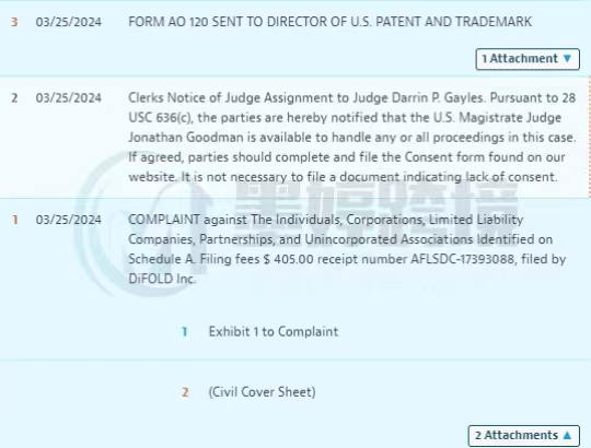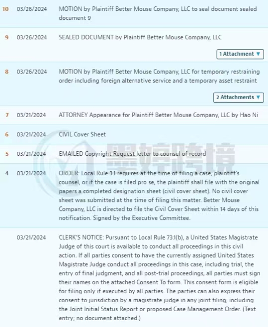 本案于2024年3月22日发起侵权诉讼,原告已在3月26日发起TRO申请,目前未有重大进展!