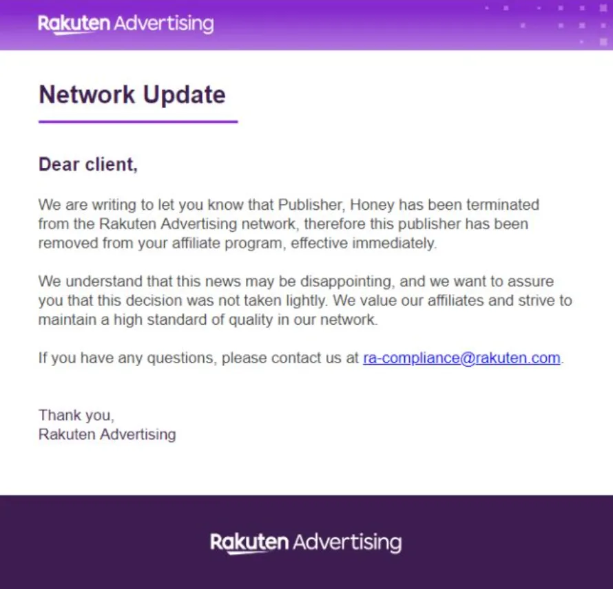 1 月 12 日,Rakuten Advertising 给广告主发邮件:Honey 被从全球网络中“终止”,立即从所有商家项目移除,约 2000 家零售商受影响。 背景是:影响创作者的集体诉讼中,出现了 Rakuten 与 PayPal 内部邮件的片段,指称 Honey 多次违反 stand‑down 政策(在识别到已有 publisher cookie 时应该“让路”,但实际并没有)。