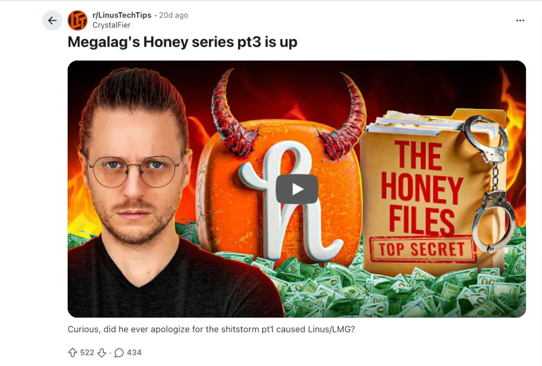 2024–2025 年,YouTuber MegaLag 连续做了3期调查视频(堪称大型纪录片之扒光Honey的赚钱黑幕),核心指控是: Honey 在结账页偷偷替换创作者/内容站的联盟 tracking,把本该属于别人的佣金“截胡”; 使用泄露/未授权的折扣码; 更关键的,是通过一段“defeat device”代码,识别“合规测试流量” 视频和后续文章发酵后,Reddit 上也出现了“后续”和“辟谣”讨论,有人认为问题被夸大,有人贴出更多技术细节,直接把讨论提升到“归因作弊”和“行业监管失职”的高度。