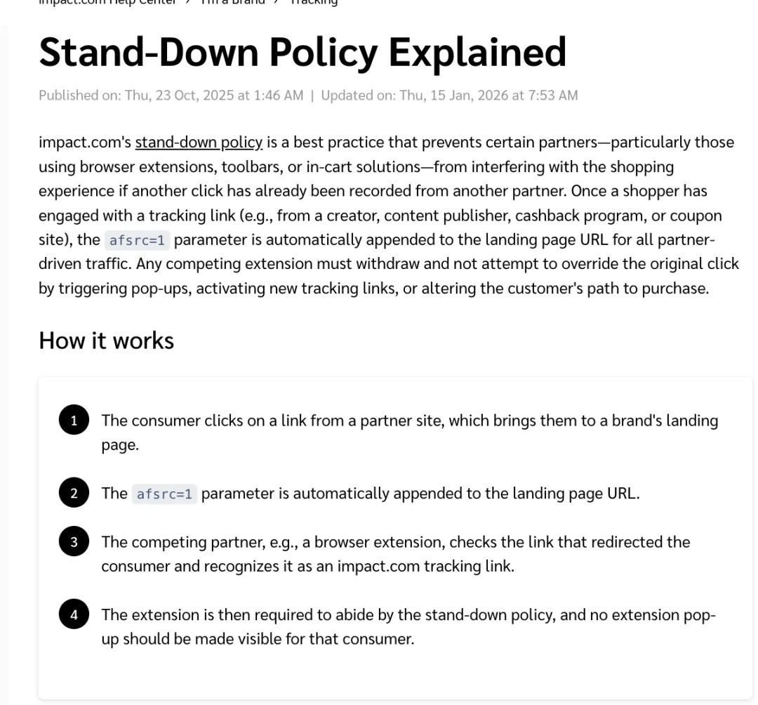 以 Impact 为例,它其实早就有 stand‑down 政策,要求联盟客按不同形态(插件、网站、App)传参数,并在识别到已有 publisher cookie 时“让路”。