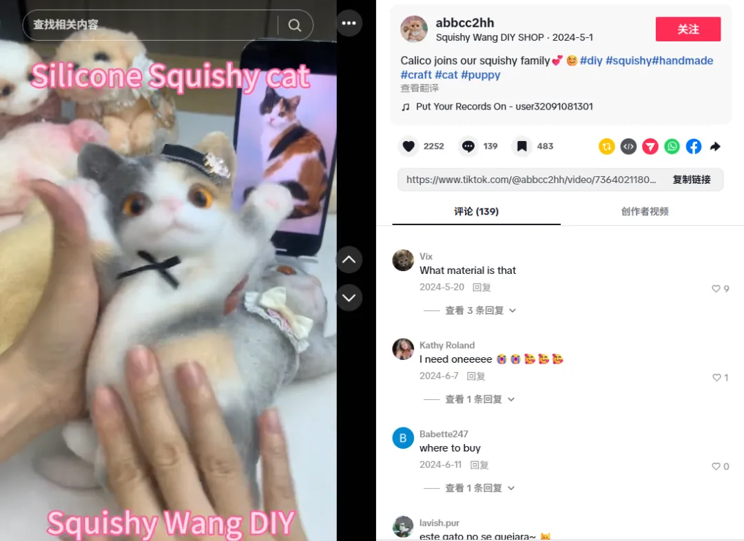 2024 年 5 月,一条打着“捏捏手工 DIY”标签的视频,播放量突然飙升至 10 万。视频背景中放着真实的猫猫照片,Wang 则在镜头前展示着猫咪捏捏的柔软手感,并标注了品牌名称和“硅胶猫咪捏捏”的字幕,评论区大量用户表现出浓厚兴趣。此后,Wang 的账号便专注于猫咪,数据也是一路攀升。