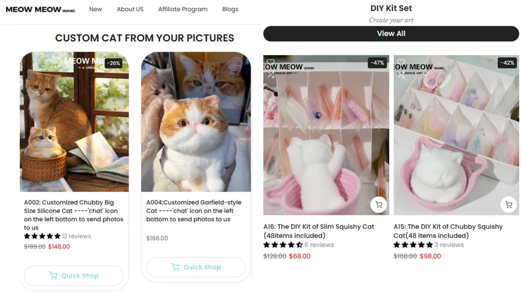 对比 Amazon 上普遍售价 15 美元左右的捏捏,目前,「Meow Meow Wang」的定制款捏捏的价格在 120-170 美元。根据不同的猫咪品种、规格大小,品牌也提供 40-88 美元的普通款捏捏;以及针对热爱手工的用户,推出了 68-98 美元的 DIY 套装。但从用户留言来看,消费者显然对 120+美元的定制捏捏更感兴趣。