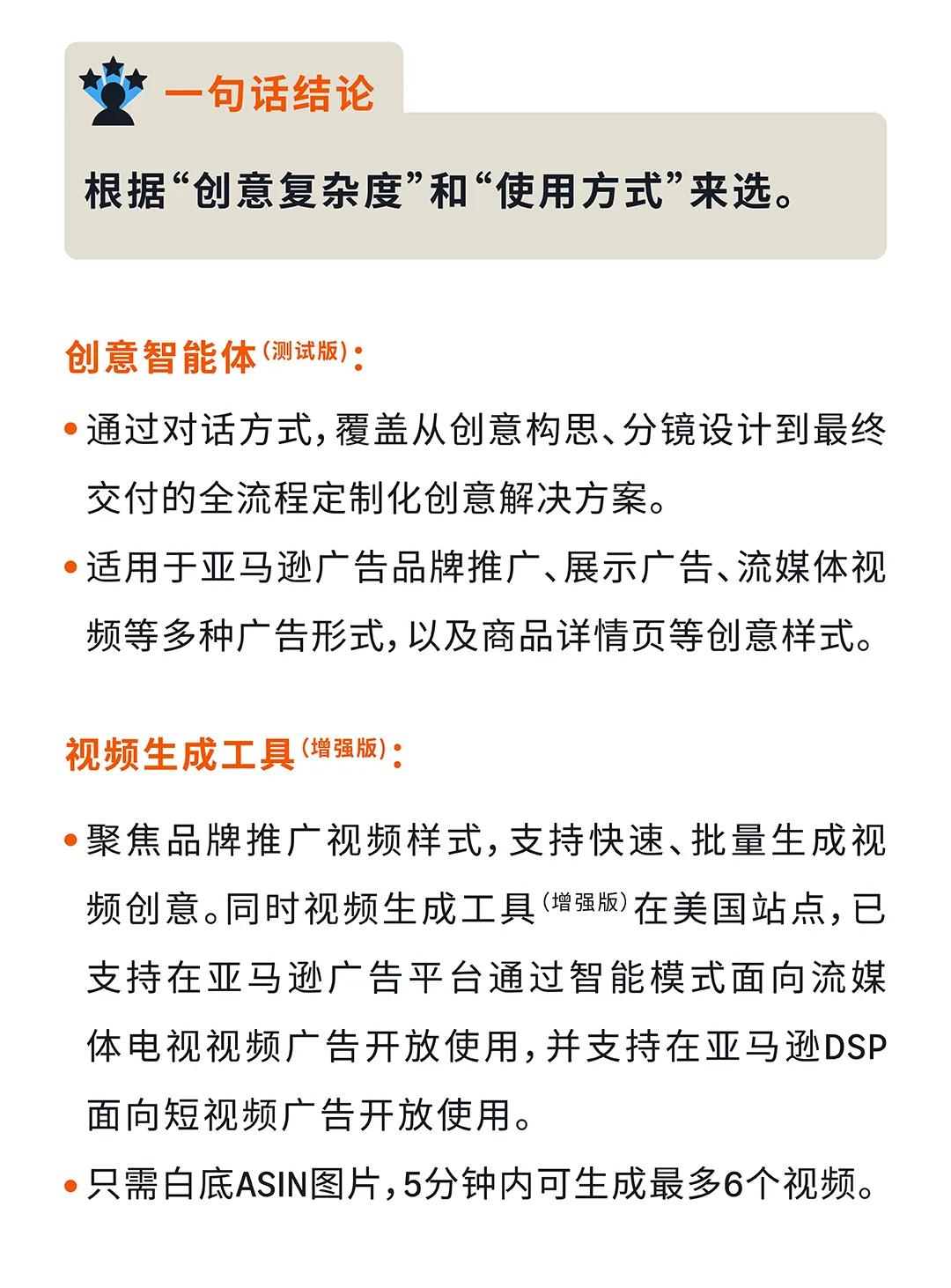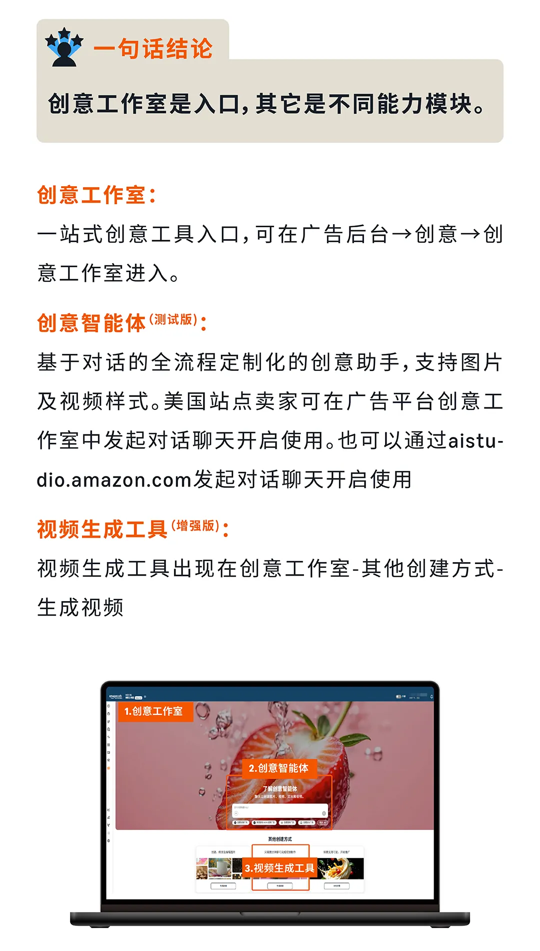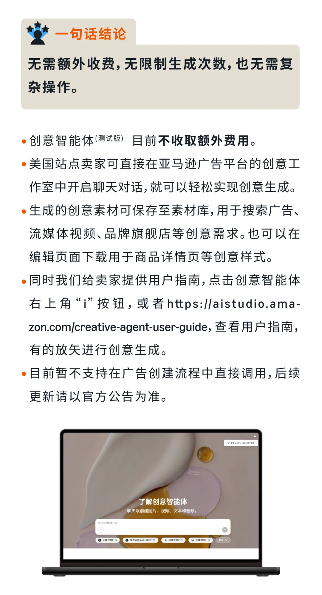 在创意侧,亚马逊正在持续强化 亚马逊广告创意服务 能力。通过创意工作室这一统一入口,卖家可以使用创意智能体进行对话式创意生成,也可以借助视频生成工具,快速批量产出广告视频素材。这些能力的核心目标,是降低创意门槛,同时提升品牌推广与视频广告的执行效率。