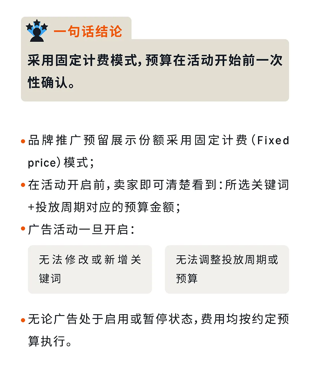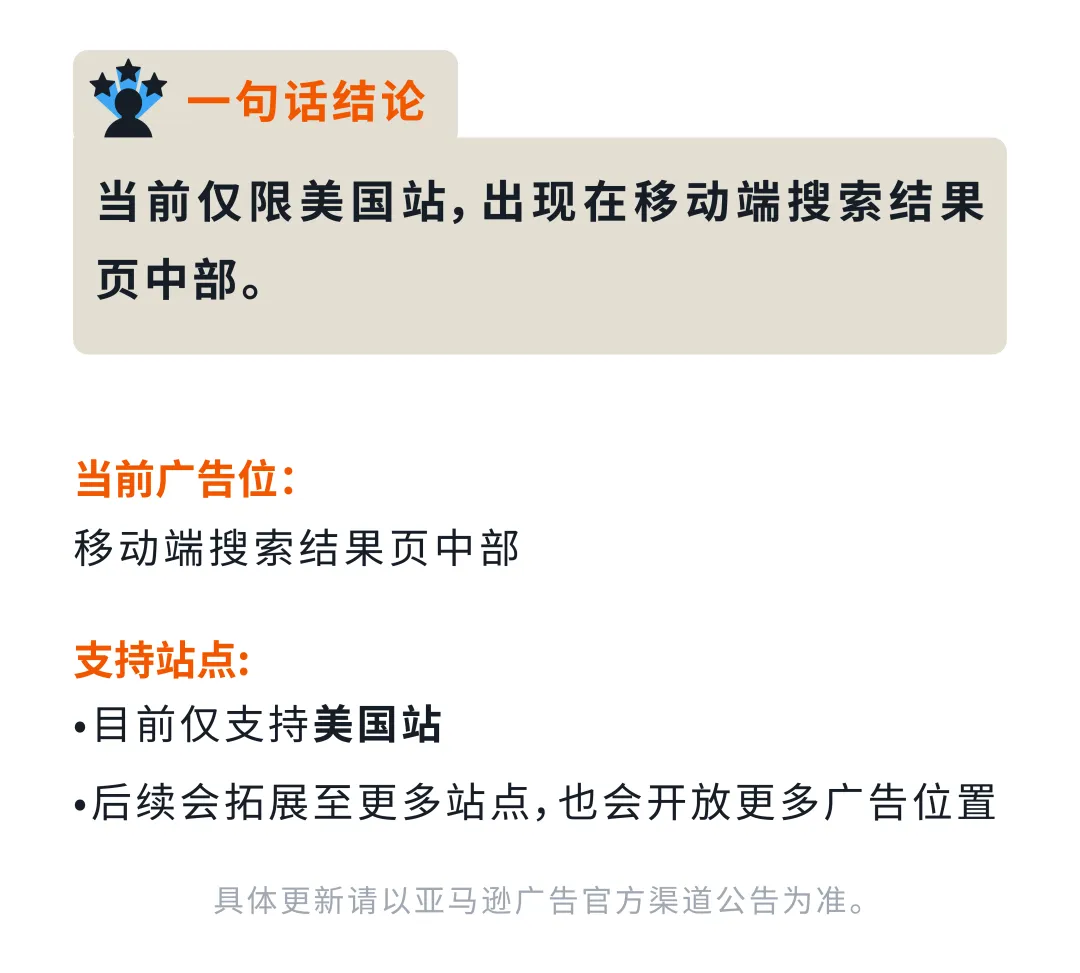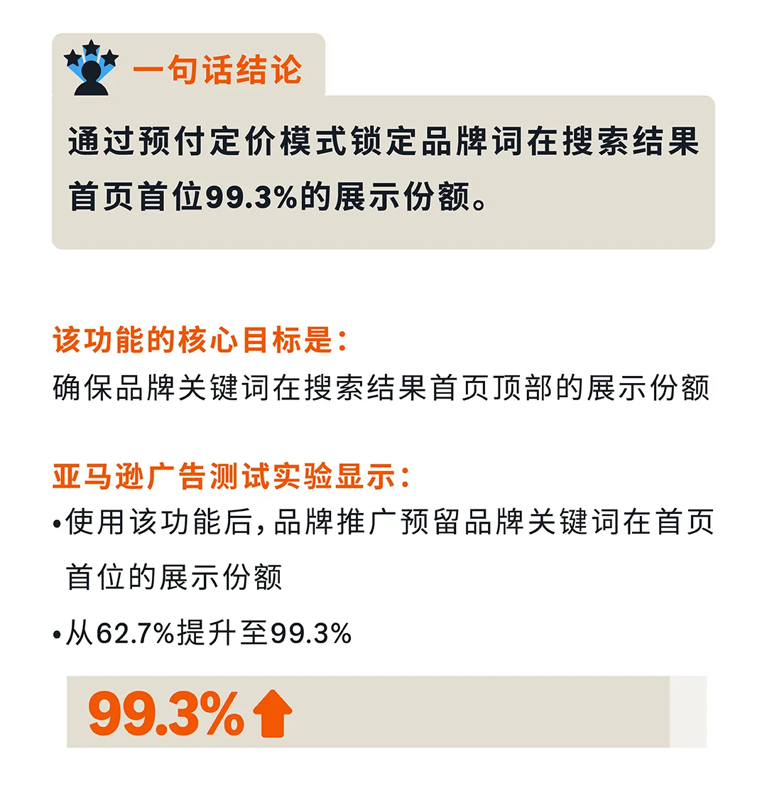 此外,围绕品牌词流量的竞争,亚马逊推出了更稳定的 亚马逊品牌广告机制。通过预留展示份额,品牌可以在关键搜索词上锁定首页顶部位置,减少竞价波动带来的不确定性,更好地承接高意向流量。