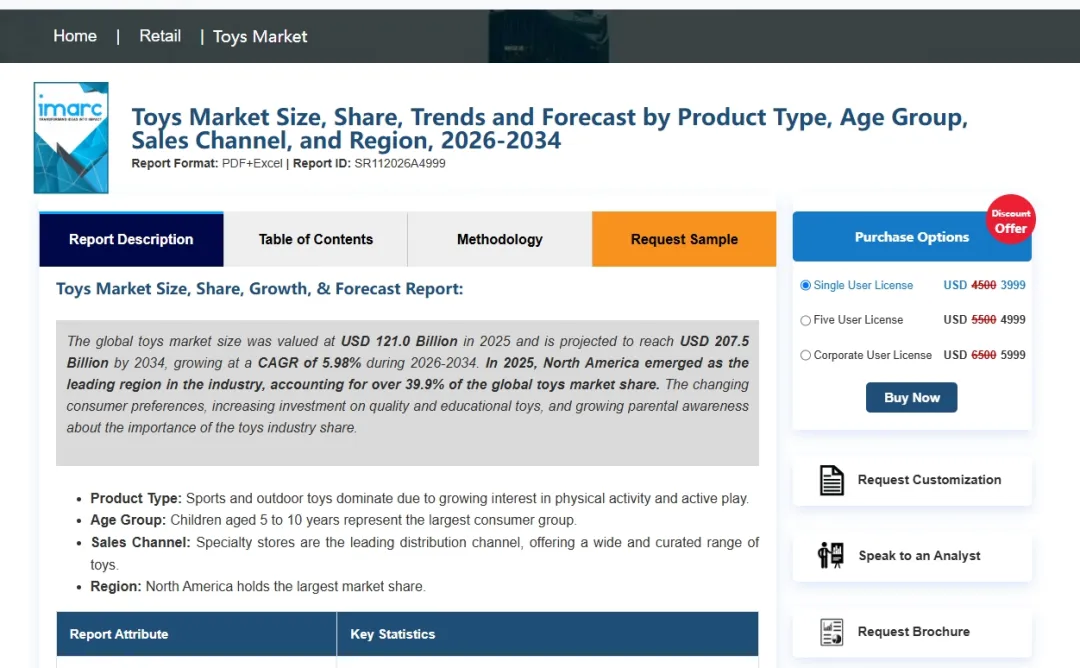 从行业整体规模来看,儿童玩具依然是一个长期稳定增长的消费赛道。根据市场研究机构 IMARC Group 的数据显示,2025年全球玩具市场规模约为 1210亿美元,预计到2034年将增长至 2075亿美元,复合年增长率约为 5.98%。在区域结构上,北美仍然是全球最大的玩具消费市场,占据接近 40% 的市场份额。