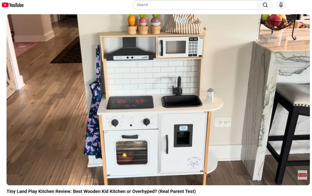 首先是 开箱和产品体验视频。在YouTube平台上,不少家庭测评类创作者会发布Tiny Land产品的开箱与体验视频。例如@CainBrandsReviews在视频中详细展示了玩具厨房的组装过程、灯光音效以及孩子的实际使用情况,通过真实体验评价产品优缺点。这类视频既能展示产品细节,也通过真实使用场景增强内容可信度。