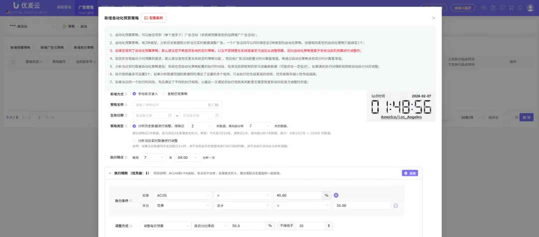 利用优麦云的“自动化预算”功能,我们可以设定一条硬性止损线。比如,设定当ACOS大于40%且花费超过30美金时,自动将预算降低50%。