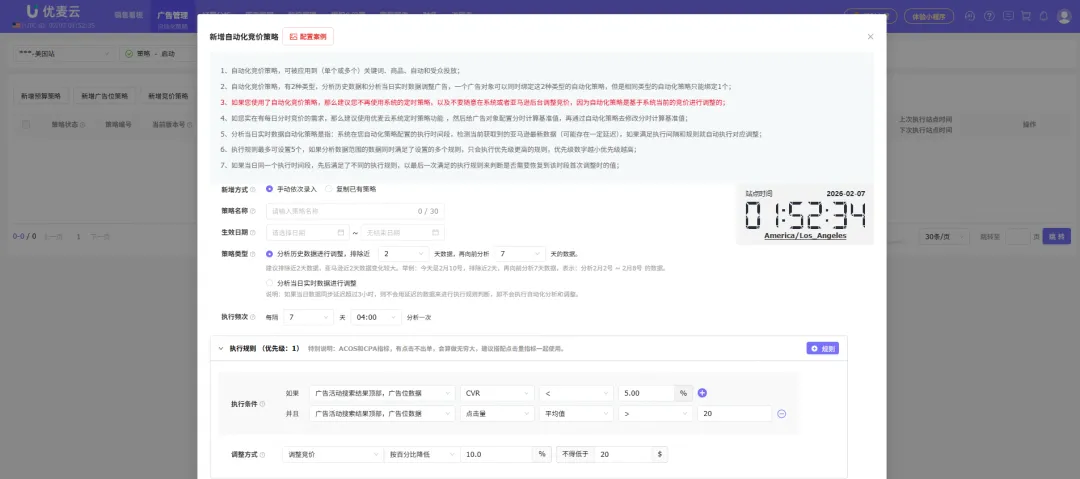 通过优麦云的“自动化竞价”策略,你可以把你的运营经验固化下来。比如,针对核心大词,设定规则:当广告位在“搜索结果顶部(首页)”且转化率(CVR)低于5%时,自动下调竞价10%。