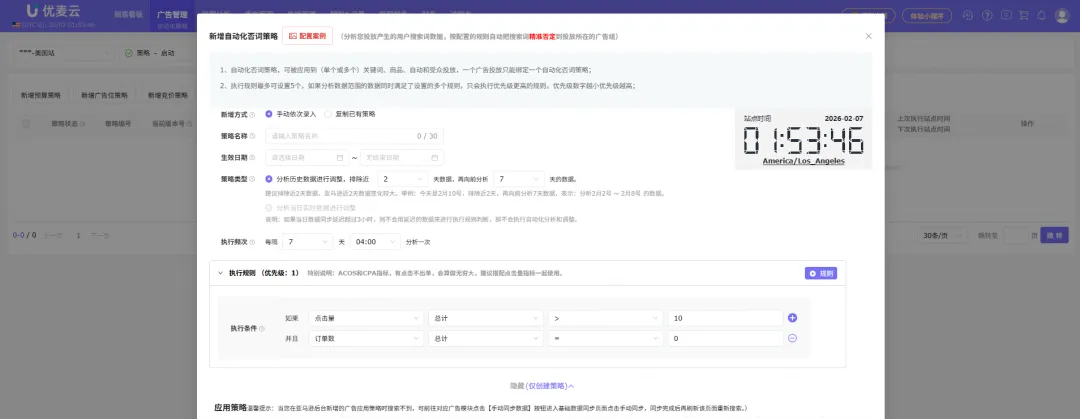 利用“自动化否词”功能,我们可以建立一个自动过滤网。设定规则:凡是点击次数超过10次且订单数为0的搜索词,直接加入精准否定。