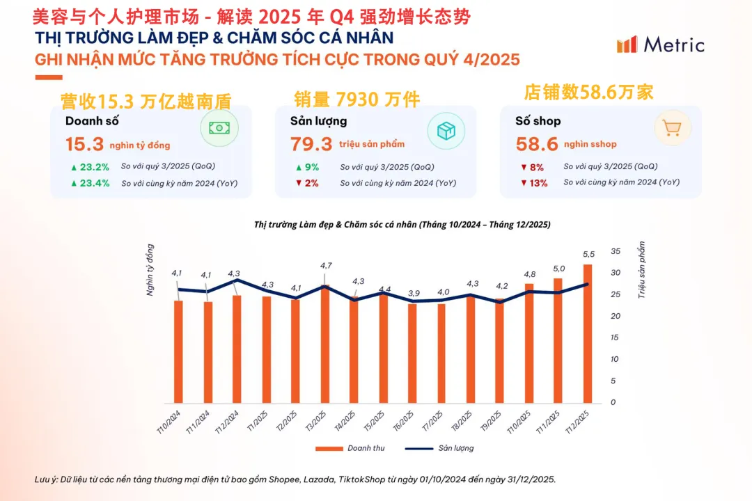 美容和个人护理产品历来是销量稳定、复购率高的“黄金品类”,根据Metric.vn发布的《2025年越南在线零售市场报告》,美容及个人护理行业以74.4万亿越南盾的销售额领跑市场,较2024年增长近30%。更重要的是,该行业已连续两个季度占据越南电子商务市场总规模的14%,成为所有品类中占比最高、增长最稳的“压舱石”。