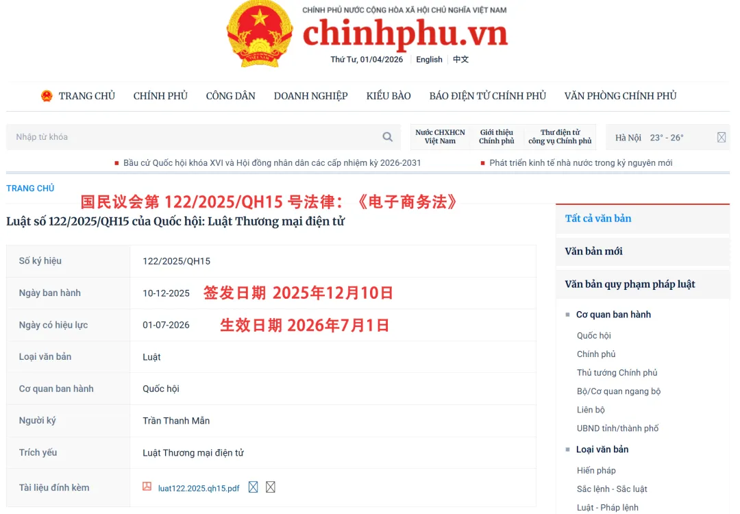 2026年7月1日起,越南首部专门针对电子商务领域的综合性《电子商务法》将正式生效,宣告电商卖家实名化时代全面到来,更明确划定了直播带货者与平台方的连带责任,为行业划定新的合规赛道。