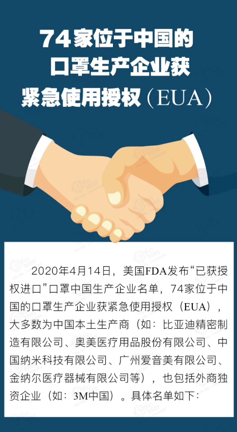 1.有NIOSH认证的生产企业,可以为其在其他国家生产的产品申请EUA,并且提供相应的可以被FDA审核的认证