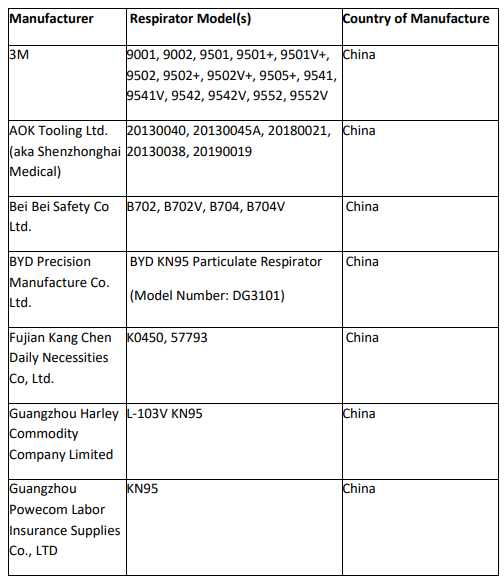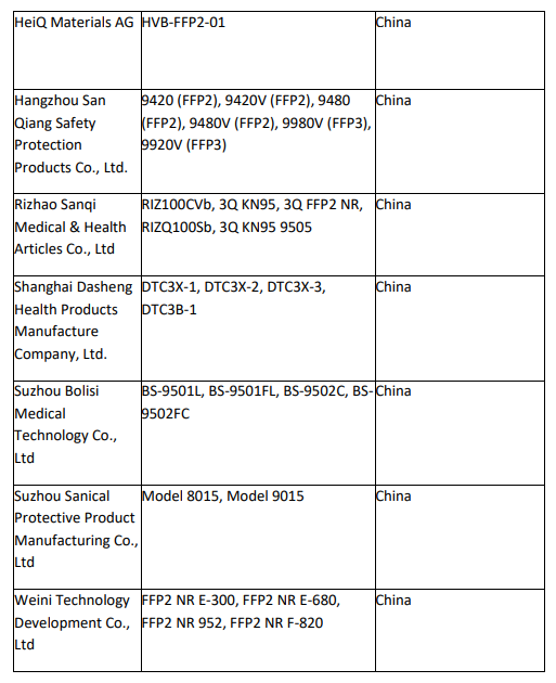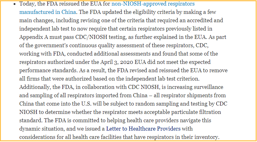 今天,FDA为在中国生产的未经NIOSH批准的呼吸器重新签发了EUA。。FDA通过进行一些主要更改来更新资格标准,包括修订其中一项标准,该标准要求经过认证的独立实验室测试,现在要求以前在附录A中列出的某些呼吸器必须通过CDC / NIOSH测试, EUA。作为政府对这些呼吸器的持续质量评估的一部分,疾病预防控制中心与FDA合作进行了另外的评估,并发现2020年4月3日EUA批准的某些呼吸器未达到预期的性能标准。结果,FDA修改并重新发布了EUA,以删除所有基于独立实验室测试标准授权的公司。此外,FDA与CDC NIOSH合作,正在加强对从中国进口的所有呼吸器的监视和采样-CDC NIOSH将对所有从中国进口到美国的呼吸器进行随机采样和测试,以确定呼吸器是否符合可接受的颗粒物过滤标准。