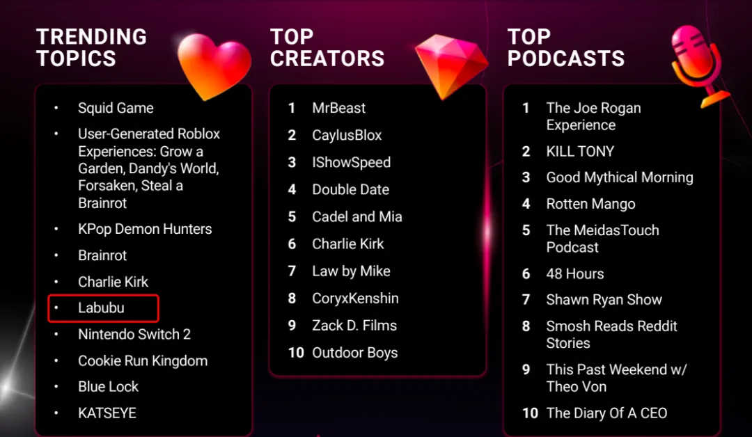 YouTube 的年度趋势榜单,是 2025 内容世界流行文化的一次大扫描。而 Labubu 在这一年依然稳居榜单前列,也说明中国品牌正在从“走出去”,走向“被世界主动认可”。