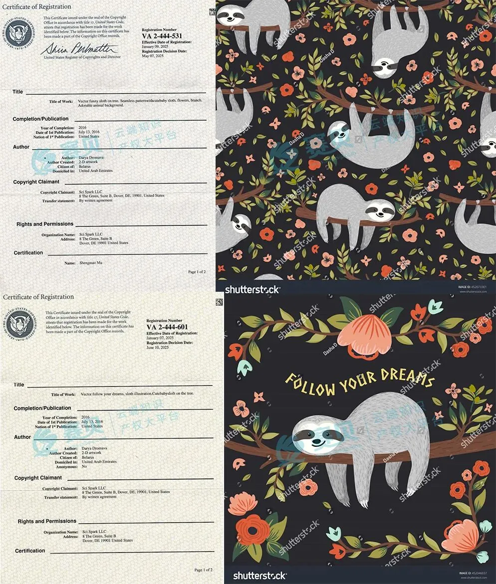 此次 Sci Spark 发起TRO诉讼,维权的是2款已在美国版权局注册的艺术作品,登记号 VA 2-444-531 和 VA 2-444-601,分别为树懒无缝图案和 “追随梦想” 树懒插画,只要你的listing上出现与这两款图案高度相似的树懒设计,无论是否修改细节,都可能构成侵权。