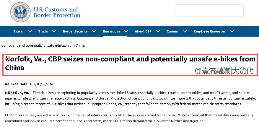 根据CBP在3月17号发布的最新通报,一批装载着e-Bike(电动自行车)的海运集装箱经查验后被确定为不合格且可能存在安全隐患产品,目前已被美国海关悉数扣押!