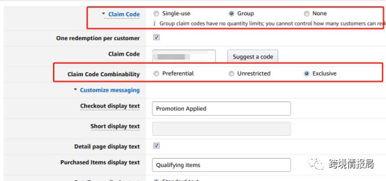1. 初涉亚马逊行业,分不清优惠码类型的卖家直接设置了Group Claim Code (无限制码)加上折扣力度很大,系统默认是勾选状态的商品详情页面显示文本(Detail Page Display Text),按钮没有取消勾选,很多买家都看到了这个优惠码,导致商品被买空,亏损金额巨大。