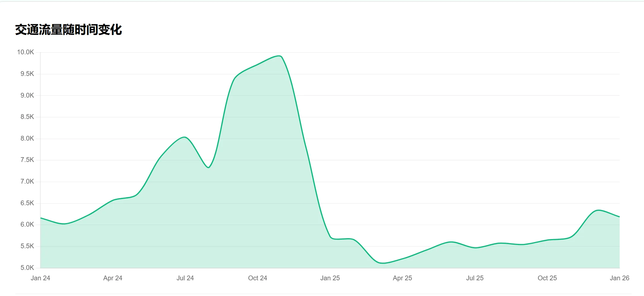 从更长的周期来看,市场流量经历了剧烈震荡:2024年秋季的强劲增长之后(9月至11月,平均流量超过9000次),2025年初遭遇断崖式下跌。尽管2025年12月和2026年1月连续两个月突破6,000次的关口,且2026年1月流量同比实现了8.0% 的增长,显示出美国市场正从节后低谷中逐步恢复,但整体流量规模已稳定在一个远低于历史高位的“新常态”区间。