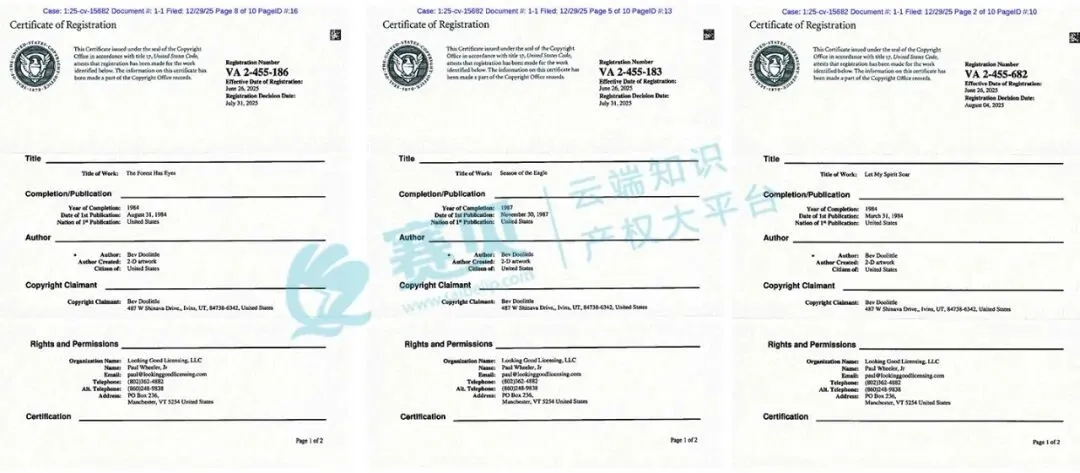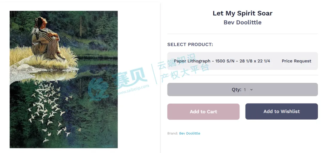 这次维权的是3幅美国西部主题作品,版权编号分别为VA 2-455-682、VA 2-455-183、VA 2-455-186,属于透明水彩画创作风格,印第安人生活场景、西部野生动物(如鹰)、马匹及广袤自然景观,充满原始野性与人文情怀为主。赛贝提醒跨境电商卖家,只要你的产品上使用了这 3 幅作品的图案元素,哪怕只是截取部分图案、轻微修改设计,都可能构成侵权。