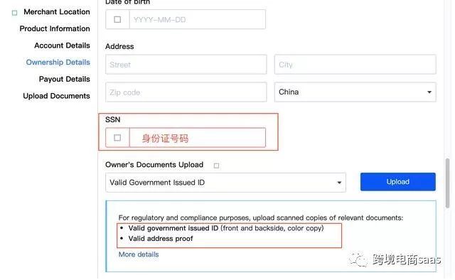 Owership details内,填写企业法人信息,其中SSN为身份证号,在Address 一栏,填写身份证上的地址信息,这样的话,在上传address proof的时候,直接上传身份证就可以作为地址证明了。如果填写其他地址,还需要提交其他地址证明文件,如水电费账单等。