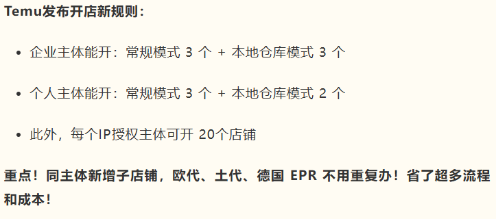 与此同时,Temu放宽店铺数量限制,单个主体可开设的全托管店铺数量从1个提升至3个。