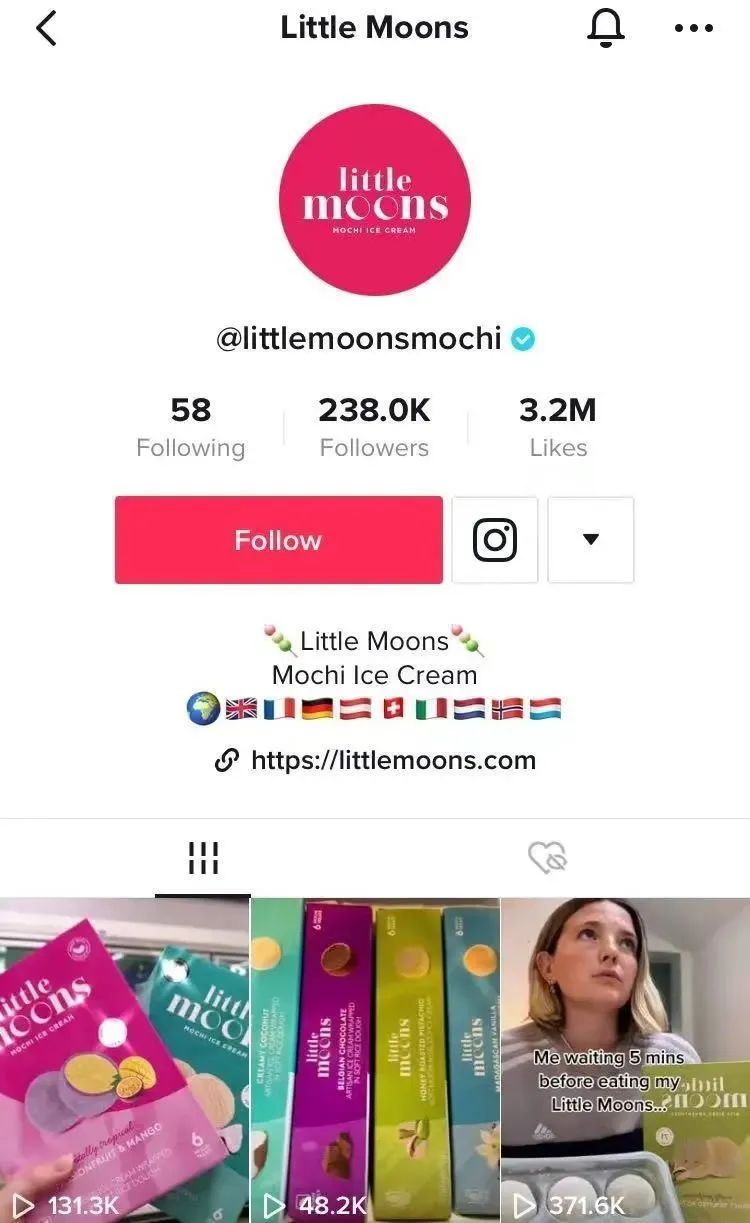 查看该品牌官方账号,果哥发现它于20年8月就入局Tik Tok了,目前Little Moons已经拥有了23.8万名TiKTok粉丝和320万个赞。