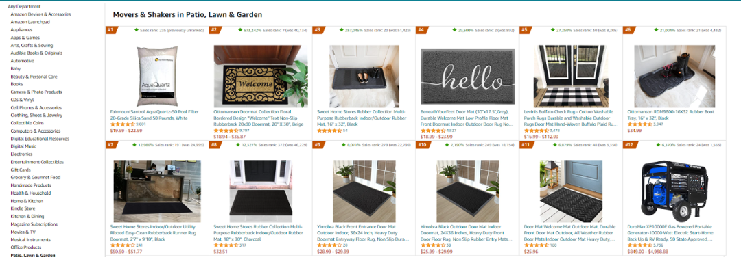今早,小编再次打开亚马逊Patio, Lawn & Garden类目的销量排行榜,发现仍在风云变化中。拿昨日排名第一的Welcome脚垫来说。