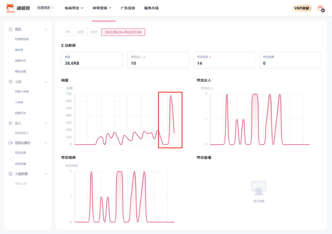 通过嘀嗒狗数据可发现这款黑头粉刺清洁器在过去的一个月几乎无销量,从7-22开始销量开始上涨,在7-23销量达到了高峰,占据热销排行榜的第三名。