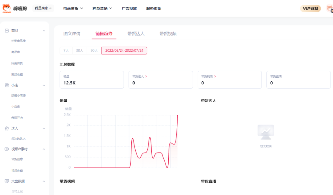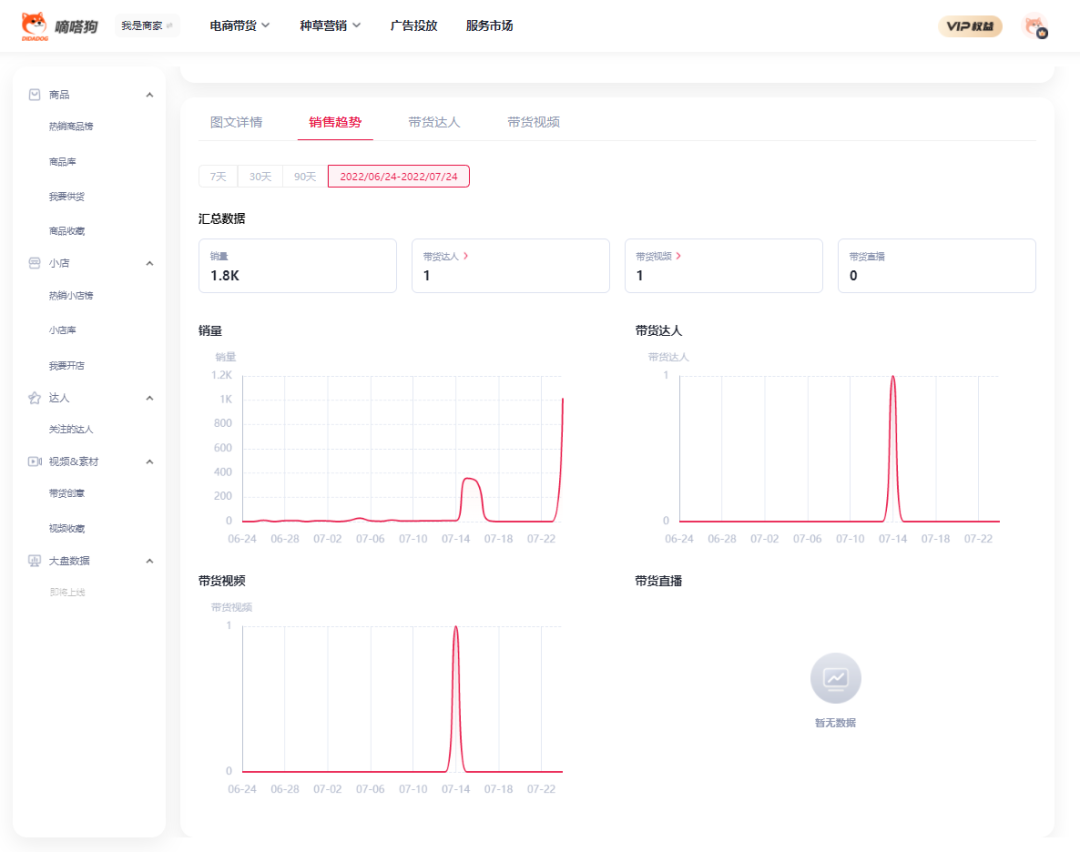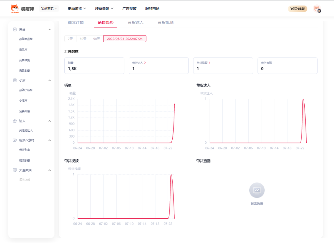 通过嘀嗒狗数据可发现这款凡士林身体乳在过去的一个月基本没有销量,在7-23销量实现了零的突破,出售了17个产品,在7-24销量更是跃上一层楼,直接达到了1800的销售量。