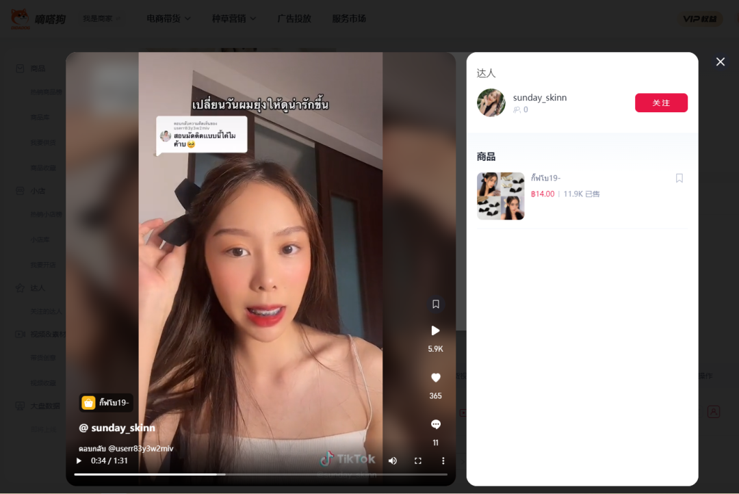 这款发夹的带货达人是泰国TikTok美妆博主,有原生感和有代入感,带货博主边讲解边亲自进行发饰的试戴和效果的展示。带货博主不仅专门拍摄了这款发夹的带货视频,在其他美妆产品的带货视频中,她也会佩戴这款发夹,达到更好的宣传效果。