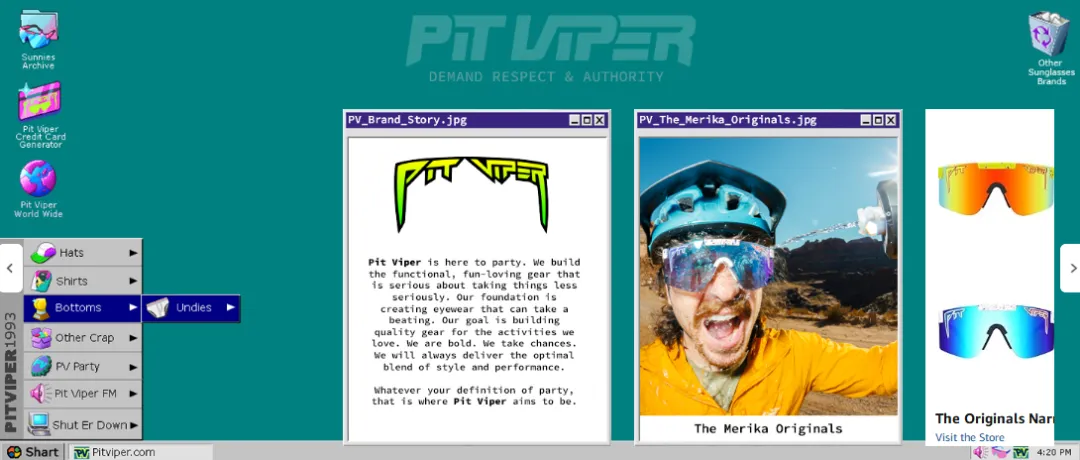 Pit Viper, LLC是美国品牌,专注运动眼镜、太阳镜、服装及配饰研发销售。它融合极限运动精神与街头潮流文化,产品以“耐用+时尚”著称,称经坐压、射击、碾压等极端测试仍能保持卓越功能性与美观度,迅速获年轻用户及户外运动爱好者青睐。