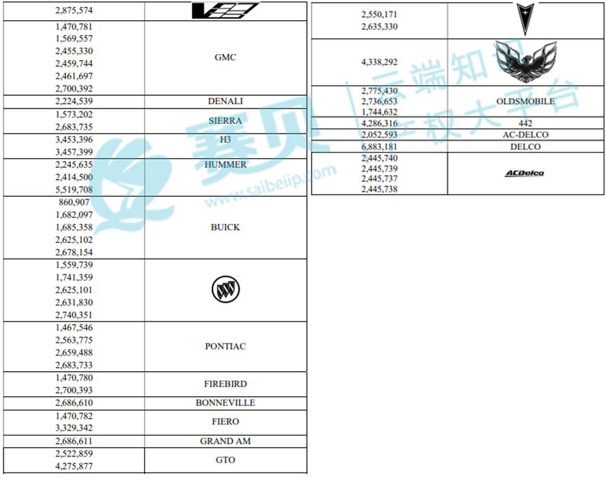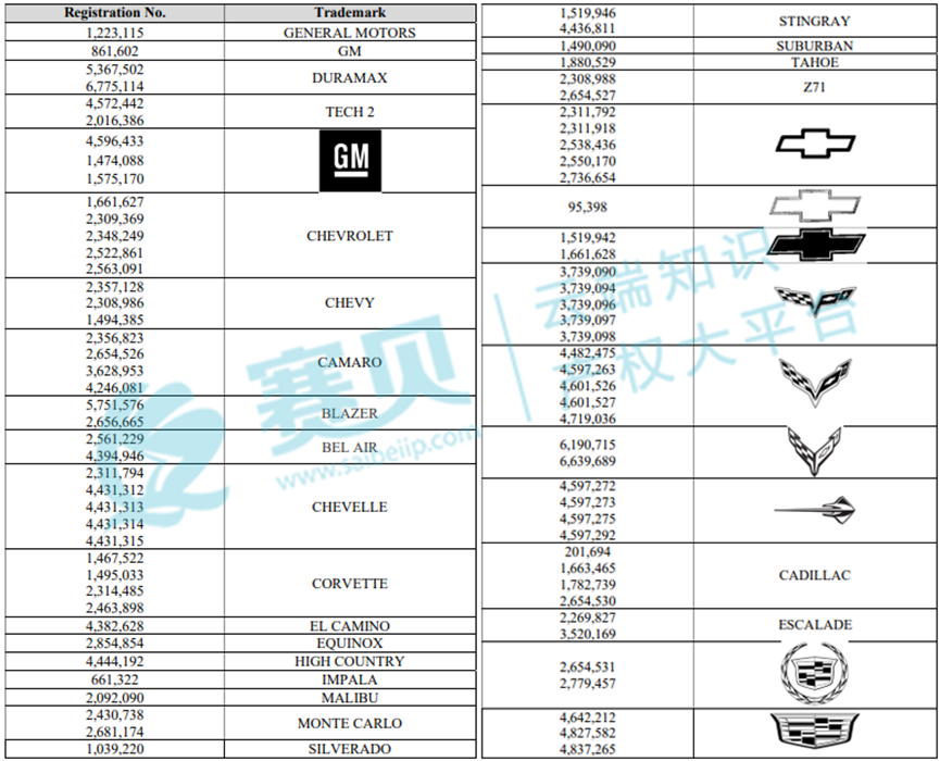 本次案件涉及多个通用汽车公司(GENERAL MOTORS)及其旗下雪佛兰(CHEVROLET)、凯迪拉克(CADILLAC)等品牌的多个美国注册商标,涵盖 GENERAL MOTORS、GM、DURAMAX等商标,赛贝提醒跨境卖家,未经授权,请勿擅自使用,以免引发侵权风险。