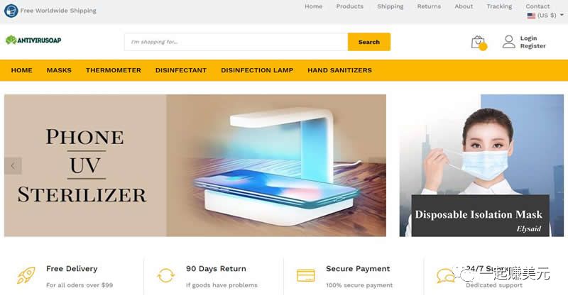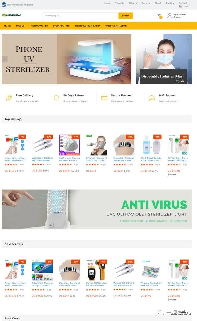 下面是我花三十分钟做好的防疫用品独立站(Antivirusoap.com),包括上架商品,只花了一个小时。看起来非常正规的网站对吧,你看完本文后也能在一个小时内搭建好,如果你看完本文,在实际操作上面遇到麻烦,可以加我微信 aod857,我会很高兴帮你解决问题。废话不说,马上开始!