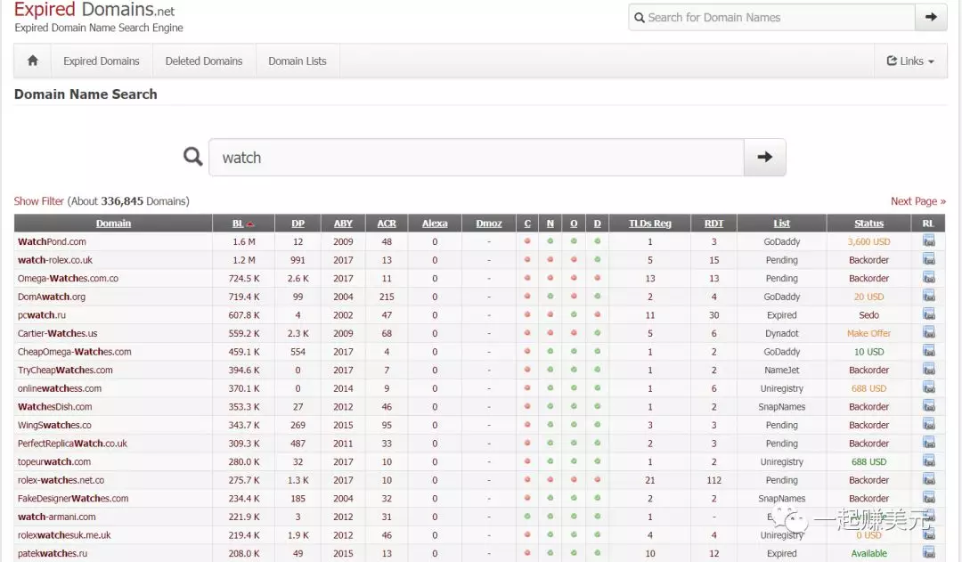 你可以使用这个网站 https://www.expireddomains.net 提供的工具查找,比如我们想卖手表,我们在搜索框输入watch,这里会列出所有的过期域名,我们点击“BL”让它按外链排序,你看,最高的域名有160万的外链,再看看这个域名的状态,标着价格,说明这个域名是别人放出来卖的,如果你是土豪,可以选择,但是我们的目标是最低成本建站,那我们要寻找状态是“Available”的域名,这些都是可以购买的。排名最高的是一个叫watch-armani.com的域名,看到这个我马上就放弃了,里面有品牌名,一定要避开这种域名,一个是可能会被投诉,一种是这种域名往往已经被仿牌玩家做烂了,被上了黑名单,这是大忌。