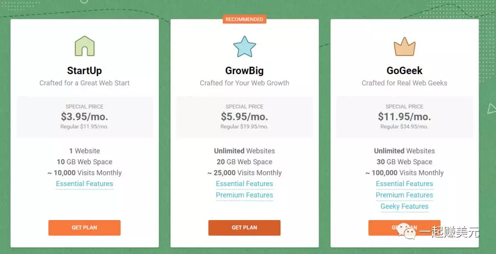 进入www.Sitegound.com的官网,官方一共提供了3种方案可供选择,如果只做一个站,StarUp计划就够用,只需要3.95美金一个月,如果想增加网站再升级不迟。