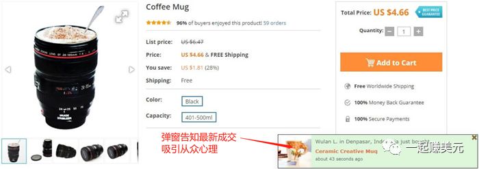 Recent Sales Pop-Up就是会在网站加一些小弹窗,弹窗里的内容就是谁谁谁刚买了这个产品,也就是social proof, 这样能增加产品可信度,提高转化率。Pop-Up会展示最近的订单、产品评论等信息,营造出一种店铺很忙很受欢迎的感觉。