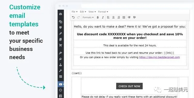 Abandoned Cart插件可以跟踪客户行为,当客户对商品感兴趣又没有当时下单,就会在客户离开后自动给客户发三次邮件提醒,还会自动给客户发送优惠券,促使客户回来购买,客户其实已经表明了心意想要购买我的产品,只是在付款的时候遇到了问题,然后就离开了,我要做的是让她们回心转意。提高转化!