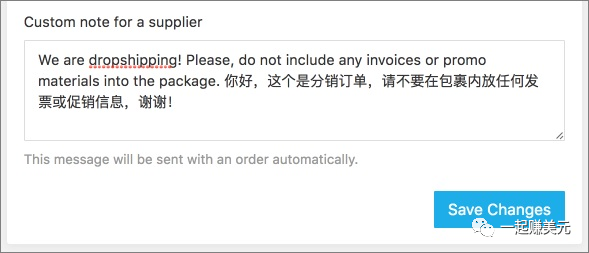 我们收到客户的钱,自然要去给客户发货,就是把客户在我们店铺下的单,填到aliexpress卖家那边。这个填单也是个精细活,特别是如果营销给力出现爆款,一天卖了几百单,如果填错了,货物自然到不了客户那边,客户收不到货投诉的话,虽然是独立站,也会被PayPal要求退款,甚至可能会被封号。这就靠自动填单插件了,只要在订单处点几下,插件就会自动到当时导入商品的卖家那里,自动下单,填上咱们这边客户的收货地址,然后插件会自动使用你在Aliexprees留下的付款方式给卖家付款。最后还会附上留言,告诉卖家我们是Dropshipper,让他不要没事给客户放什么优惠券营销了,避免客户发现我们是搬运的。