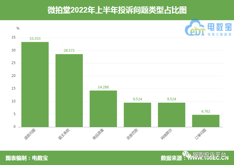 此外,“电诉宝”受理用户维权案例显示,“微拍堂”2022年上半年还涉嫌存在退款问题、霸王条款、商品质量、恶意罚款、网络欺诈和订单问题等。