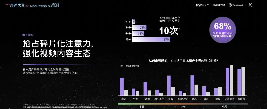 在日本市场,用户对 X 的依赖度超出很多人的想象,他们的使用习惯非常高频、碎片化。从清晨通勤路上,到工作间隙,再到深夜睡前,X 几乎贯穿了日本用户的一整天。数据显示,57%的日本用户每天打开 X 至少10次,而且他们的对话中,有68%都包含视频内容。