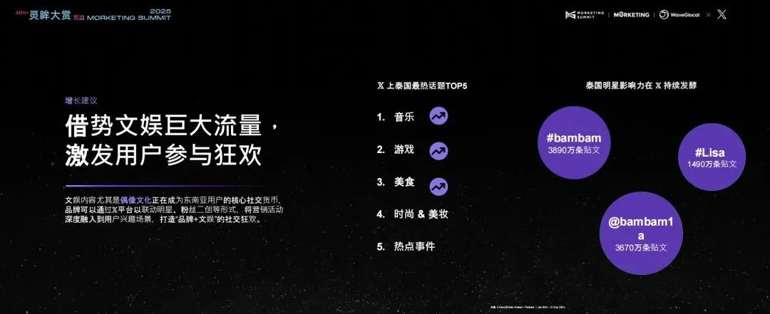 拿泰国来说,音乐、游戏、美食、时尚&美妆和热点事件,是当地用户在 X 上最常讨论的五大话题。像bambam、Lisa这样的泰国明星,在 X 上依然保持巨大的影响力,相关话题动辄就能达到数千万条帖子,用户的参与热情非常高。