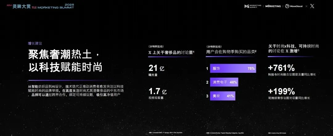 而现在中东市场有个很明显的新趋势,奢侈品和科技正在加速融合,从智能织物到 AI 设计,技术进化让消费者越来越关注有“科技赋能”的时尚品牌。X 上围绕“时尚+科技+可持续”的讨论一直在升温,相关话题量同比激增了761%,可持续奢侈品的讨论量也增长了199%,这说明用户在用真实的兴趣推动趋势,也为品牌提供了巨大的市场入口。
