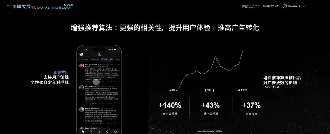 在这场全球新消费的浪潮中,X 在这方面已经有了成熟的实践,我们已经和XAI深度融合,通过XAI模型 Grok ,打造了从“用户洞察-精准触达-转化提升”的全链路 AI 能力,为品牌提供可衡量的增长价值。