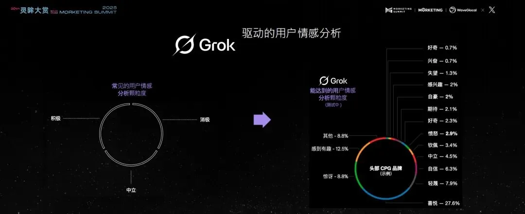 Grok 在用户情感衡量上的突破,对品牌来说特别有价值。大家应该有体会,现在市面上的用户情绪分析工具,大多只能给出“正面、中立、负面”这种粗放的判断,根本没法满足精细化运营的需求。但 Grok 不一样,它是唯一一个能实时读取 X 全部原生讨论的模型,所以它不仅能看到完整的数据,还能理解数据背后的真实情绪。