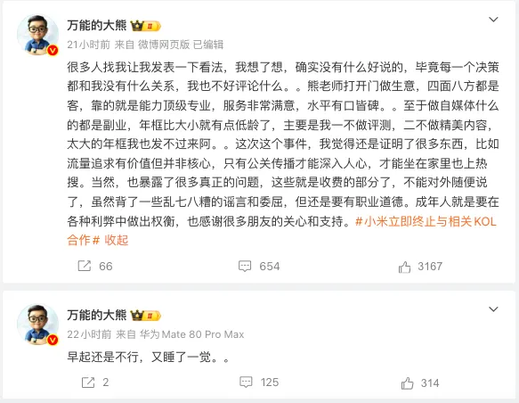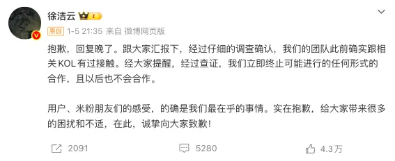 今天的朋友圈被小米的一则处罚公告刷屏了。雷军不久前刚在新年直播中对近期的相关“谣言”进行澄清,甚至现场拆车。没想到,才过几天又出了一个新的危机:与KOL合作出了严重问题,并因此辞退和处罚了涉事员工和高管。