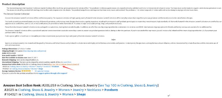 这个listing在in Clothing, Shoes & Jewelry (服装、鞋及饰品)这个大类的排名在第 206,659名,在子类 Necklaces > Pendants (项链吊坠)的排名第2023名,在另外一个子类Women> Shops (女性商店)的排名第104321名。